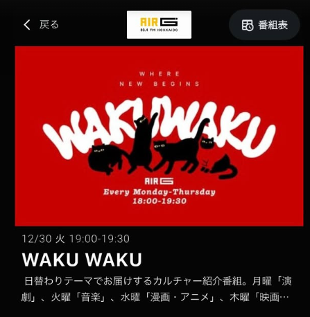 1)WAKU WAKU | AIR-G'(FM北海道) | 2025/12/30/火 19:00-19:30